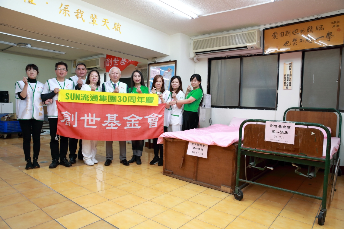 SUN流通集團感於曹慶先生致力於社會福利工作的毅力和決心,用一雙腳行遍全台各地、四處奔波,一家一戶沿門扥缽拜訪說明、募集善款,全體員工皆深深地被其善心打動,每個月自動自發從薪資戶頭提撥部分金額捐贈至創世,1995年,由當時的社長川端光帶領著社員們,初次來到創世北平分院參訪。當時的創世基金會猶在草創初期,經費設備都還遠遠不足,第一張安置植物人的床位還是從街頭撿回的廢棄衣櫃,簡易鋪上枕頭和棉被,成了第一張克難病床。